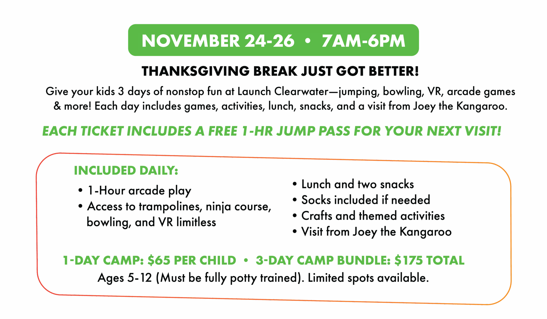 Launch Family Entertainment Clearwater reserves the right to modify, suspend, or terminate any offer at any time. Participation constitutes acceptance of these terms. Additional rules may apply; please see a team member for details.
