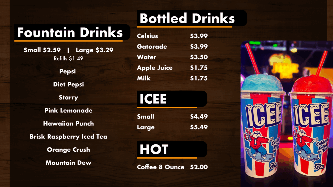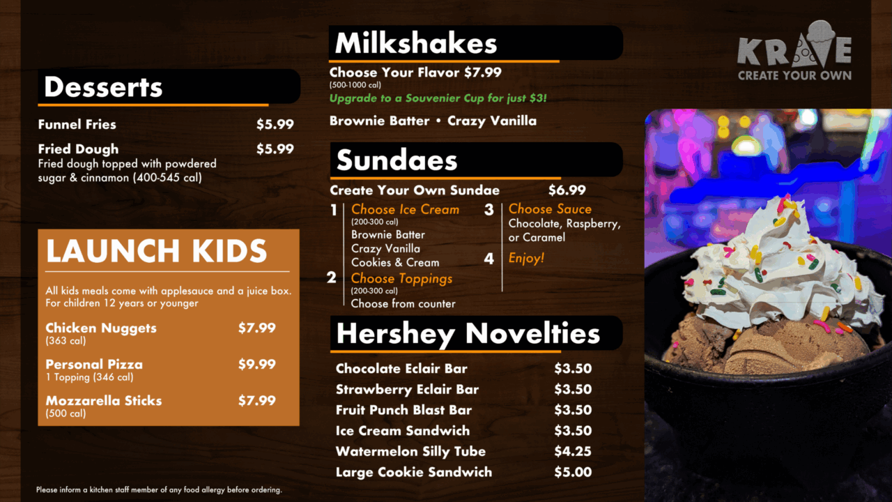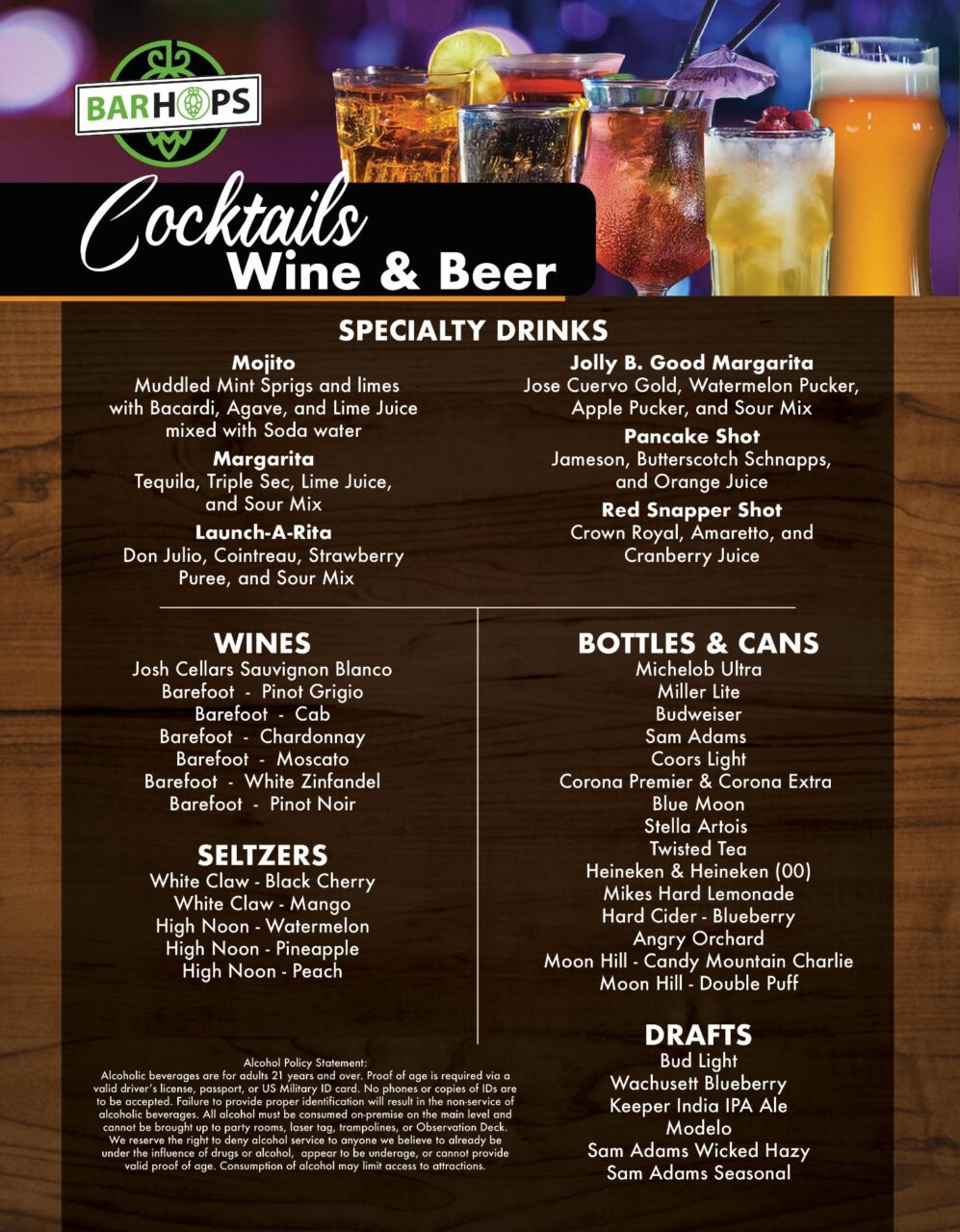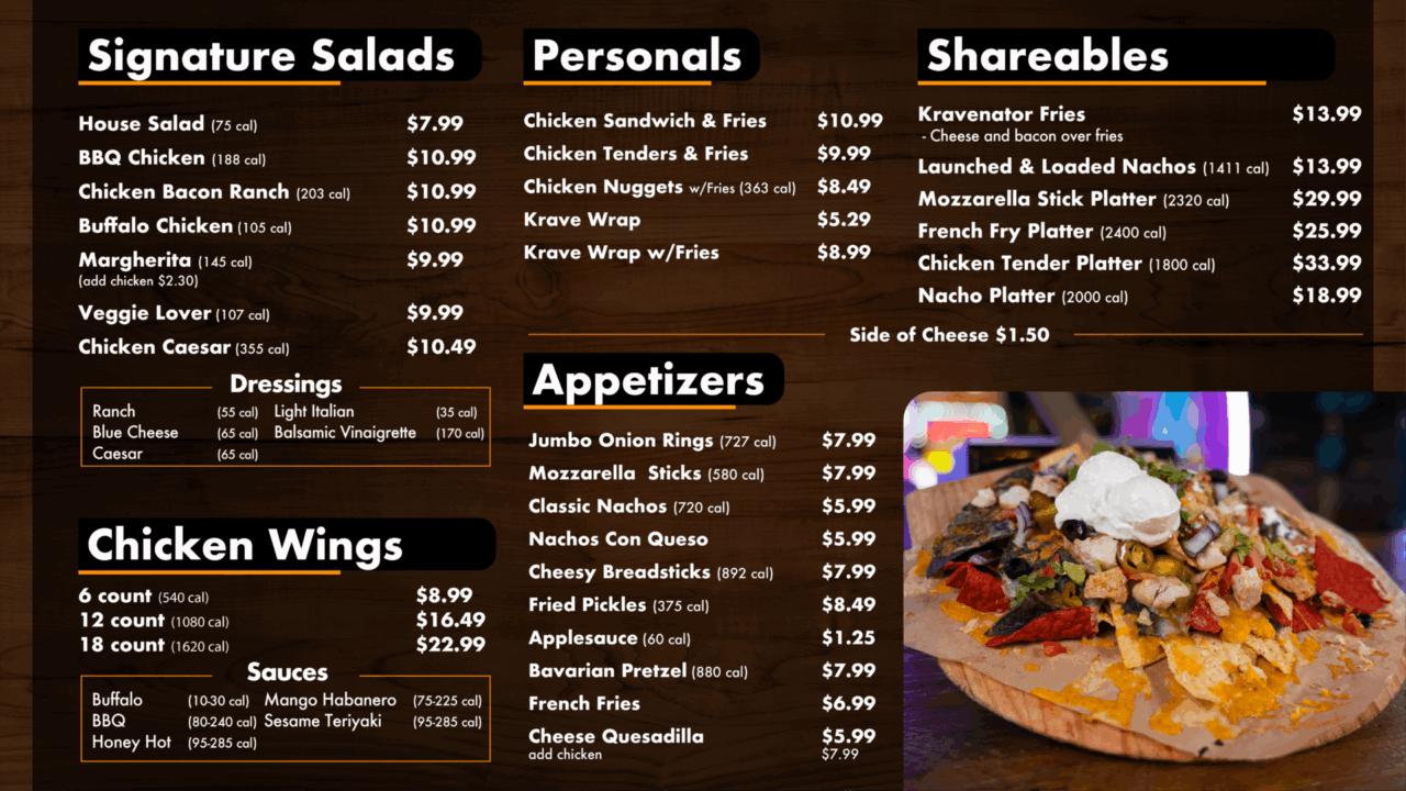 Tax not included. *Calorie information based on one slice of pizza. More nutritional information available upon request. Please inform a staff member if someone in your party has an allergy. Menu items subject to change at any time. Alcoholic beverages are for adults 21 years of age and over. Valid IDs will be checked.