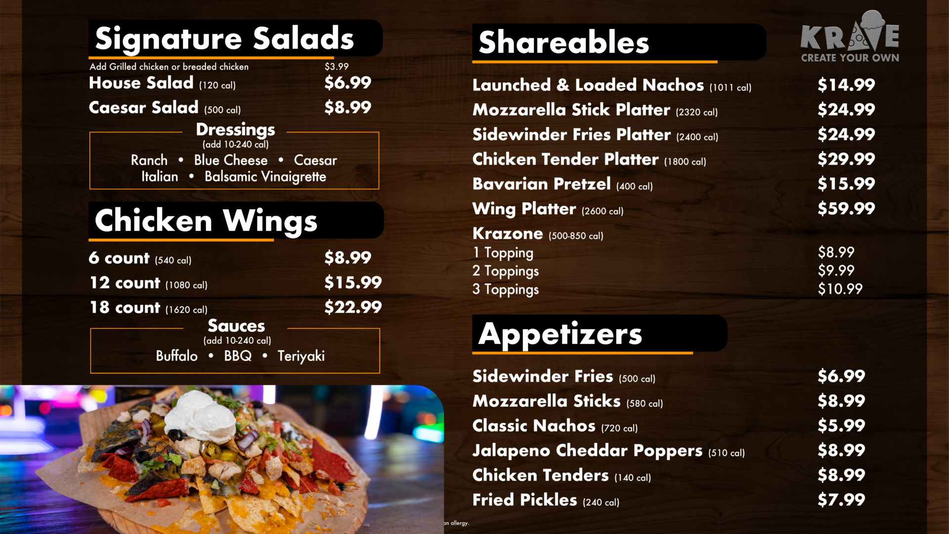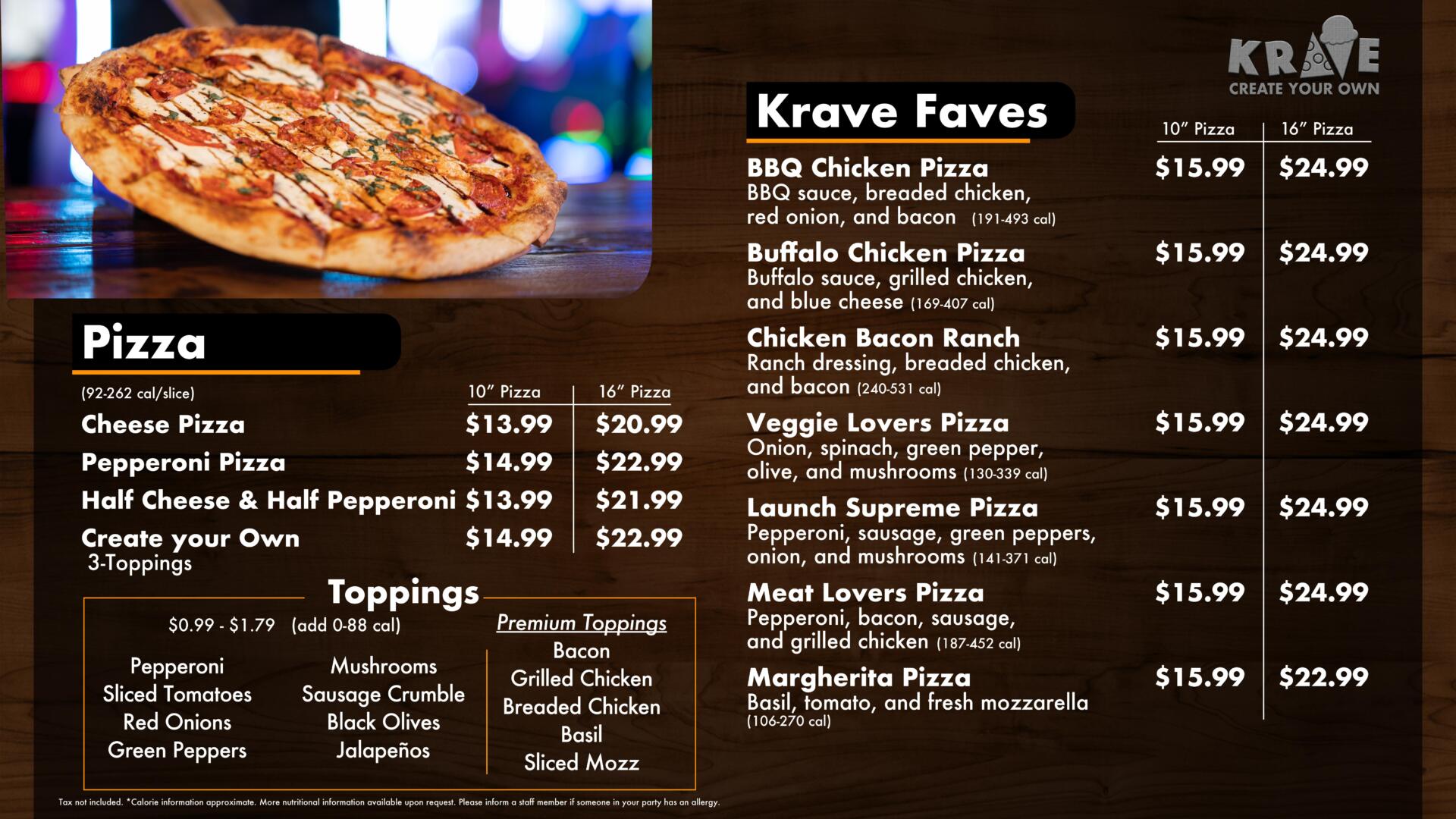 Our Krave Menu features a lineup of comfort foods everyone loves. Enjoy fresh, cheesy pizza or dive into crispy chicken tenders and wings. Fill up on loaded fries with mouthwatering toppings. Snack lovers can share nachos, mozzarella sticks, or a combo platter with family and friends. Everything is prepared fresh and served fast so you can get right back into the action.