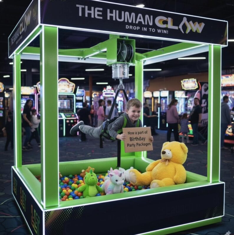 Human Claw Machine: You’re not just playing the game, you are the game! The Giant Human Claw Machine lets you become the claw itself, soaring over a pit of prizes as you try to grab your ultimate reward. Big thrills, big laughs, and even bigger wins await!