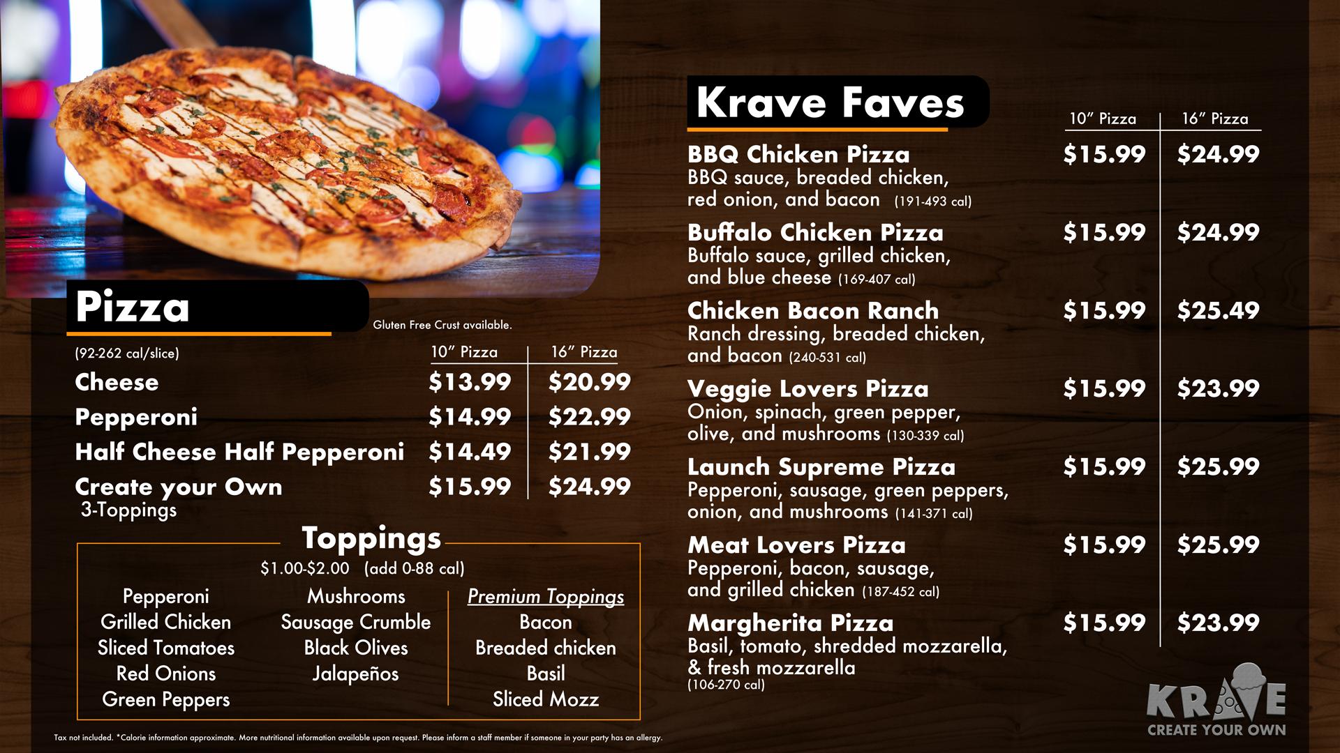 Our Krave Menu features a lineup of comfort foods everyone loves. Grab a slice of hot, cheesy pizza or dig into crispy chicken tenders and wings. Load up on fries piled high with toppings. Snack lovers can share nachos, mozzarella sticks, or a combo platter with family and friends. Everything is made fresh and served fast so you can jump right back into the action.